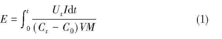 能耗是雙很膜電滲析過(guò)程的一個(gè)重要指標(biāo)。本實(shí)驗(yàn)中, 雙很膜產(chǎn)生的OH-部分參與PFS的制備, 很難測(cè)定OH-的產(chǎn)生總量。因此, 能耗E (kW·h/kg H2SO4) 的計(jì)算基準(zhǔn)為雙很膜產(chǎn)生的H+量, 具體計(jì)算如式 (1) 。